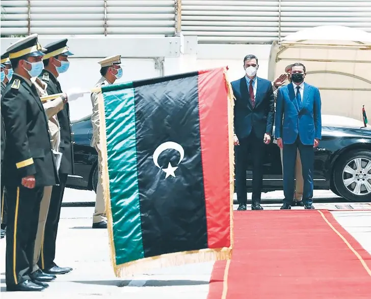 El presidente del Gobierno, Pedro Sánchez, junto al primer ministro de Libia, Abdul Hamid Dbeiba, en la visita de 2021